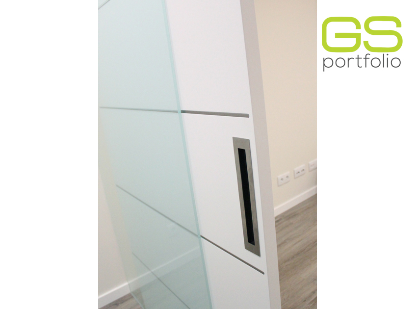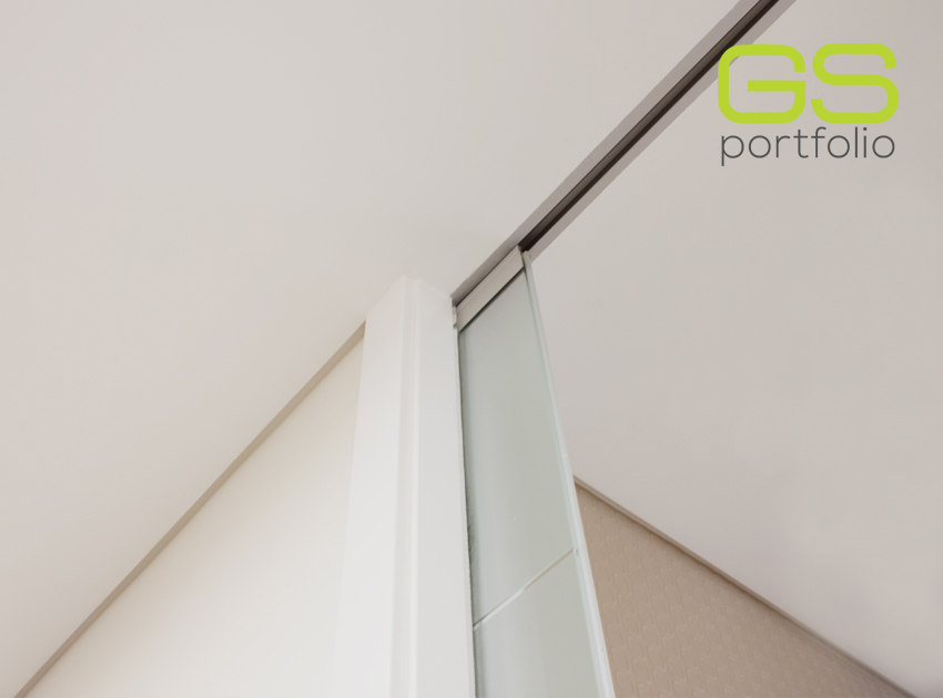 - Système de porte coulissante INSIDE by OPENSPACE avec porte laquée blanc mat avec coins. Conjugué avec un panneau en verre mat blanc fixe avec coins.