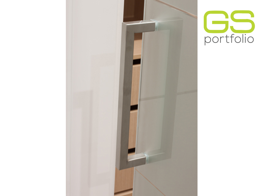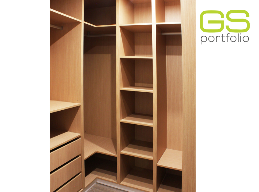 - Dressing GS CONCEPT avec séparateurs, étagère à chaussures et tiroirs avec glissières cachées et système de fermeture amortie. Compartiment fermé avec porte coulissante en verre blanc dépoli.