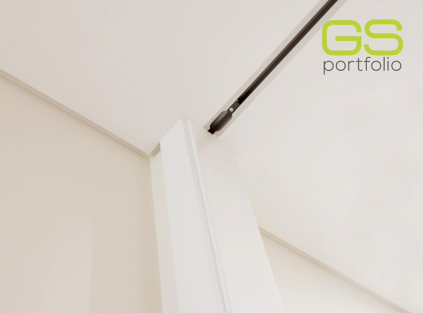 - Porte battante GS DOORS, modèle PLUS (jusqu'au plafond), en laqué blanc mat avec coins. Serrure magnétique.