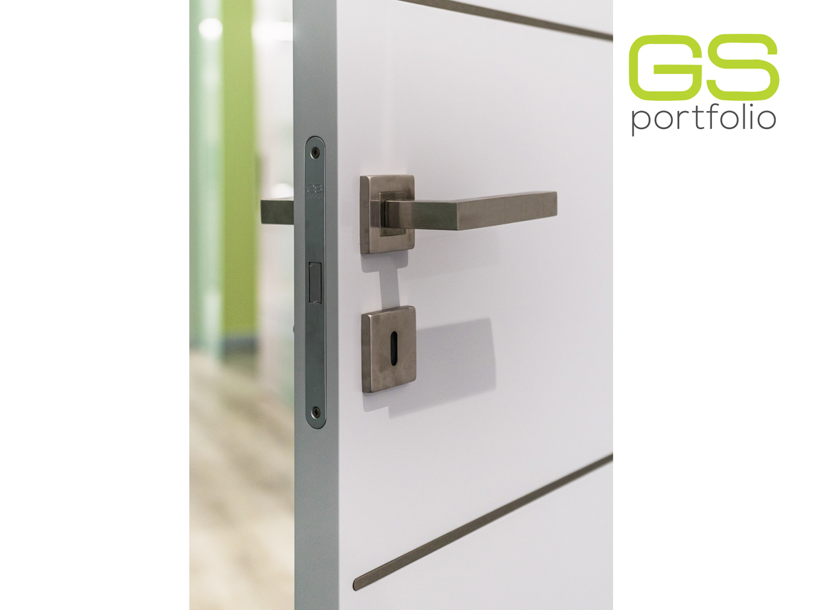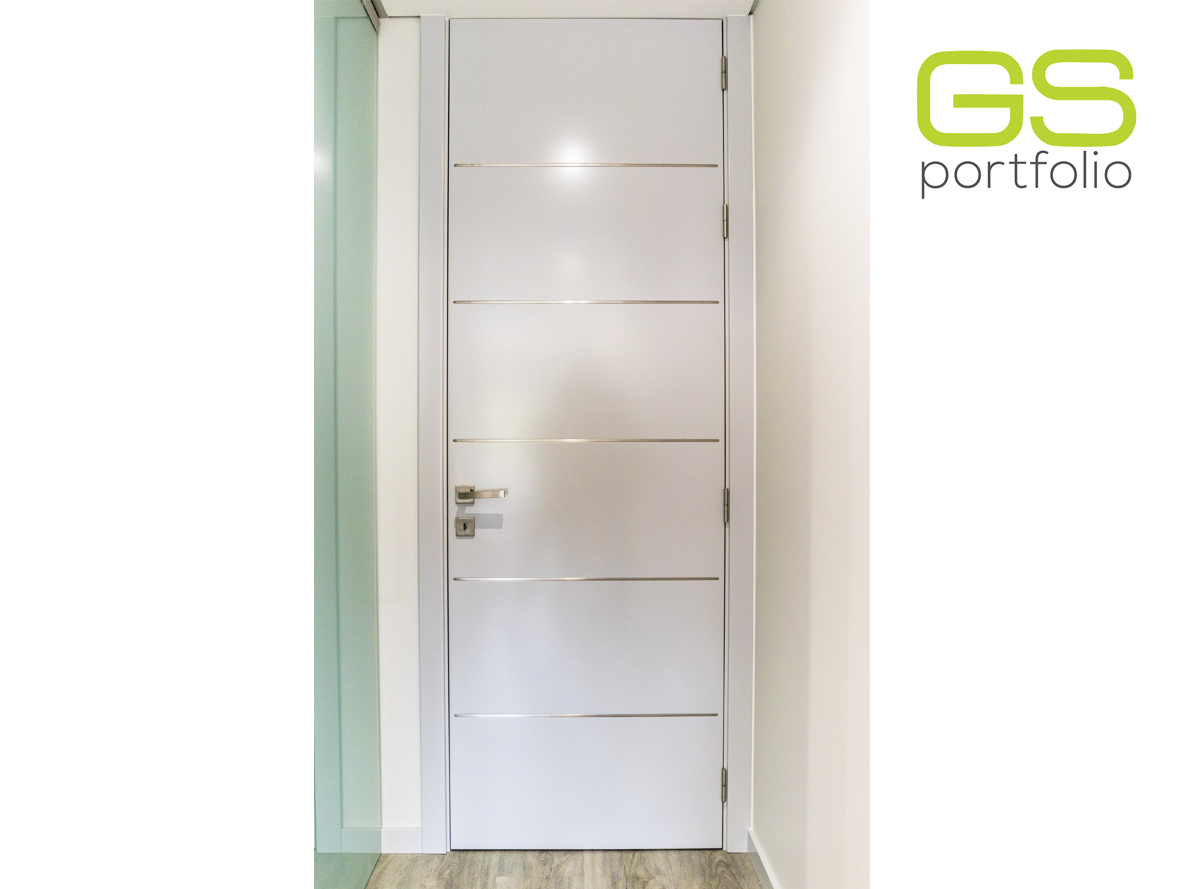- Porte battante GS DOORS, modèle PLUS (jusqu'au plafond), en laqué blanc mat avec coins. Serrure magnétique.
