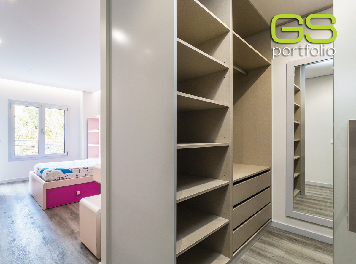 - Placard avec séparateurs, étagère à chaussures et tiroirs avec glissières cachées et système de fermeture amortie par GS CONCEPT. Compartiment fermé avec une porte coulissante en verre dépoli blanc.