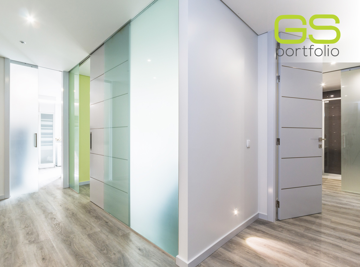 - Système de porte coulissante INSIDE by OPENSPACE avec porte laquée blanc mat avec coins. Conjugué avec un panneau en verre mat blanc fixe avec coins.
