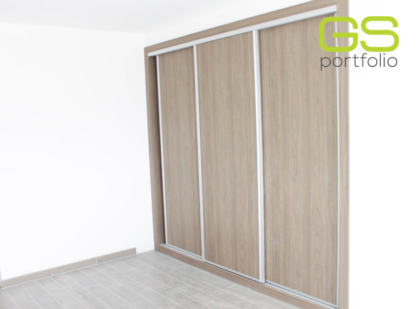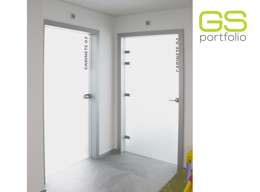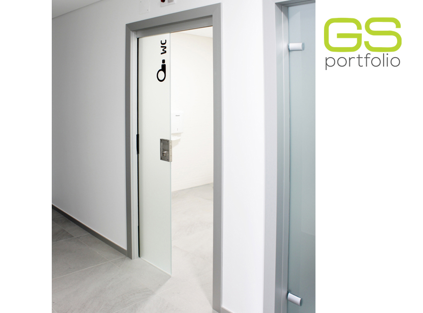 - Contre-châssis pour portes à galandage – ÚNICO. Porte en verre blanc mat avec habillage et bandeau cache-rail en aluminium