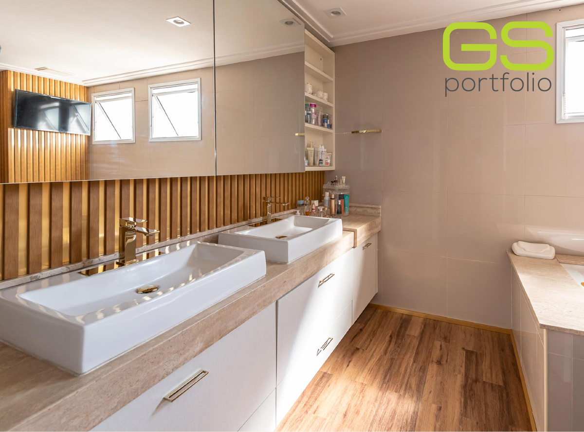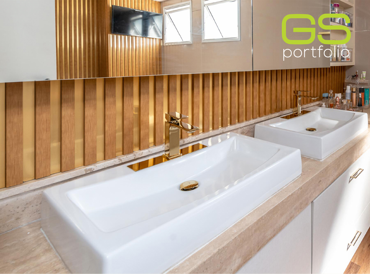 Aplicação de friso decorativo 30x16 mm em COBRE em conjugação com o friso 23,5 x 8 mm em OXI OURO ROSÉ. Moradia Unifamiliar.